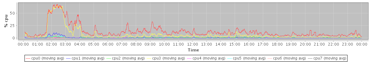 avg(cpu0) = 13.15 avg(cpu1) = 0.49 avg(cpu2) = 0.54 avg(cpu3) = 6.67 avg(cpu4) = 0.39 avg(cpu5) = 0.23 avg(cpu6) = 0.09 avg(cpu7) = 0.06