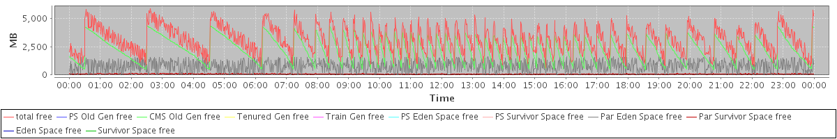 avg(total free) = 3115.60 avg(PS Old Gen free) = 0.00 avg(CMS Old Gen free) = 2231.08 avg(Tenured Gen free) = 0.00 avg(Train Gen free) = 0.00 avg(PS Eden Space free) = 0.00 avg(PS Survivor Space free) = 0.00 avg(Par Eden Space free) = 806.41 avg(Par Survivor Space free) = 78.11 avg(Eden Space free) = 0.00 avg(Survivor Space free) = 0.00