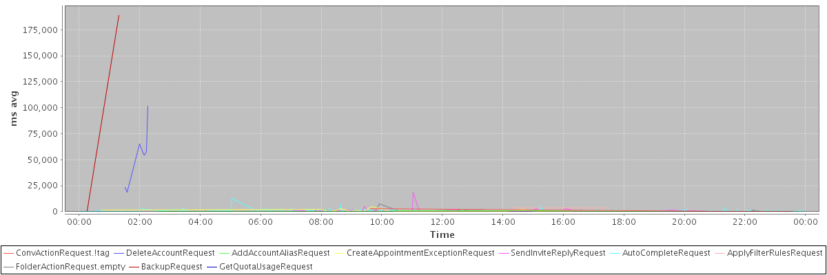 avg(ConvActionRequest.!tag) = 892.33 avg(DeleteAccountRequest) = 53708.71 avg(AddAccountAliasRequest) = 489.25 avg(CreateAppointmentExceptionRequest) = 692.27 avg(SendInviteReplyRequest) = 737.74 avg(AutoCompleteRequest) = 472.09 avg(ApplyFilterRulesRequest) = 3432.33 avg(FolderActionRequest.empty) = 562.96 avg(BackupRequest) = 94788.00 avg(GetQuotaUsageRequest) = 1723.00