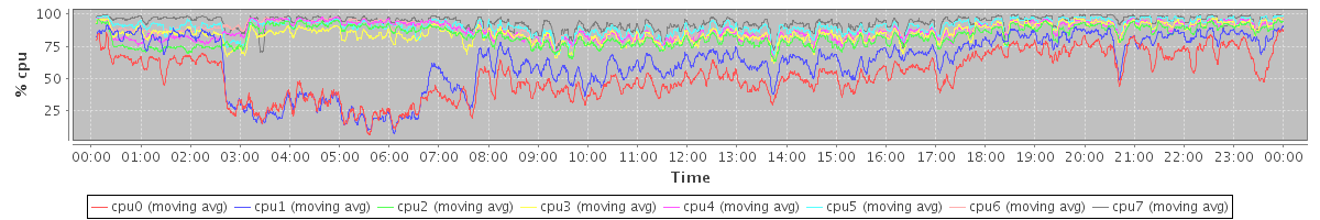 avg(cpu0) = 1.73 avg(cpu1) = 1.50 avg(cpu2) = 1.44 avg(cpu3) = 1.24 avg(cpu4) = 1.16 avg(cpu5) = 0.93 avg(cpu6) = 1.02 avg(cpu7) = 0.67