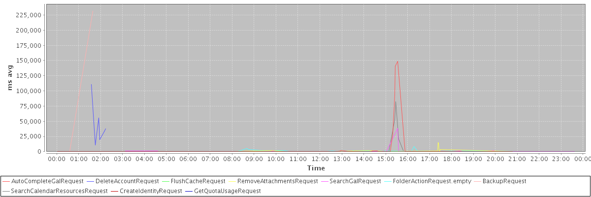 avg(AutoCompleteGalRequest) = 5867.60 avg(DeleteAccountRequest) = 44594.67 avg(FlushCacheRequest) = 1393.00 avg(RemoveAttachmentsRequest) = 2584.12 avg(SearchGalRequest) = 1104.36 avg(FolderActionRequest.empty) = 1153.76 avg(BackupRequest) = 116182.50 avg(SearchCalendarResourcesRequest) = 1656.44 avg(CreateIdentityRequest) = 1420.00 avg(GetQuotaUsageRequest) = 2143.00