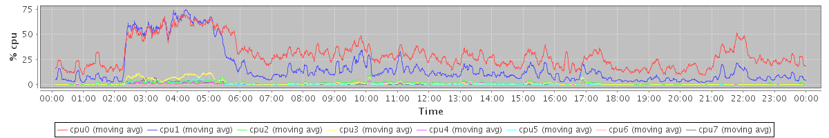 avg(cpu0) = 1.19 avg(cpu1) = 1.11 avg(cpu2) = 0.84 avg(cpu3) = 0.69 avg(cpu4) = 0.66 avg(cpu5) = 0.54 avg(cpu6) = 0.57 avg(cpu7) = 0.50