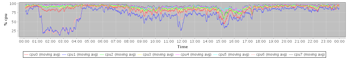 avg(cpu0) = 85.43 avg(cpu1) = 69.23 avg(cpu2) = 90.53 avg(cpu3) = 89.81 avg(cpu4) = 93.25 avg(cpu5) = 93.32 avg(cpu6) = 78.06 avg(cpu7) = 94.22