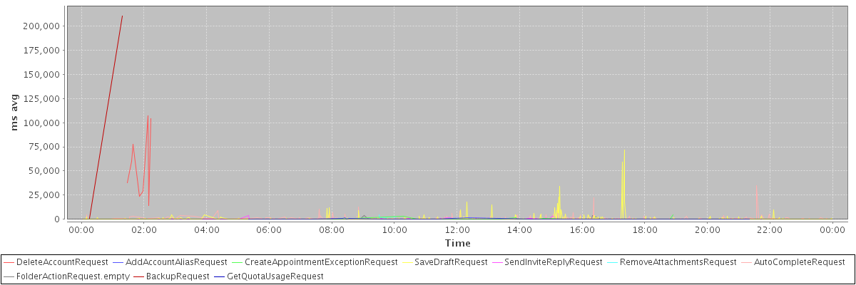 avg(DeleteAccountRequest) = 56689.75 avg(AddAccountAliasRequest) = 502.40 avg(CreateAppointmentExceptionRequest) = 550.70 avg(SaveDraftRequest) = 720.81 avg(SendInviteReplyRequest) = 512.89 avg(RemoveAttachmentsRequest) = 2451.75 avg(AutoCompleteRequest) = 741.69 avg(FolderActionRequest.empty) = 548.58 avg(BackupRequest) = 105653.00 avg(GetQuotaUsageRequest) = 1775.00