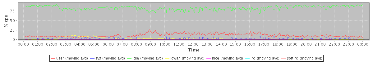 avg(user) = 11.31 avg(sys) = 2.50 avg(idle) = 83.42 avg(iowait) = 2.50 avg(nice) = 0.10 avg(irq) = 0.00 avg(softirq) = 0.17