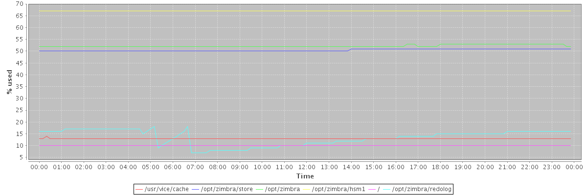 avg(/usr/vice/cache) = 13.01 avg(/opt/zimbra/store) = 50.42 avg(/opt/zimbra) = 52.26 avg(/opt/zimbra/hsm1) = 67.00 avg(/) = 10.00 avg(/opt/zimbra/redolog) = 13.42