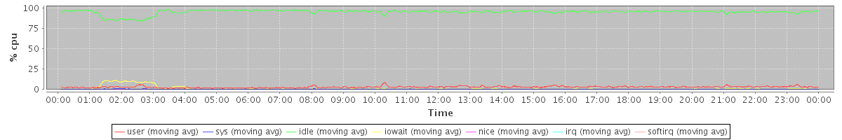 avg(user) = 3.00 avg(sys) = 0.31 avg(idle) = 95.34 avg(iowait) = 1.22 avg(nice) = 0.10 avg(irq) = 0.00 avg(softirq) = 0.01