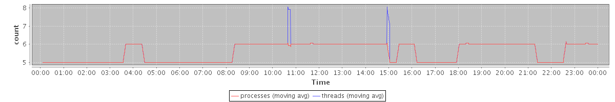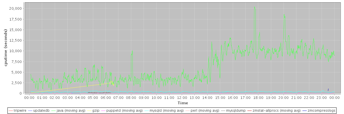 avg(tripwire) = 2068.00 avg(updatedb) = 18.77 avg(java) = 6136.93 avg(gzip) = 2306.18 avg(puppetd) = 11.90 avg(mysqld) = 371.31 avg(perl) = 9.08 avg(mysqldump) = 139.32 avg(zmstat-allprocs) = 12.06 avg(zmcompresslogs) = 872.50