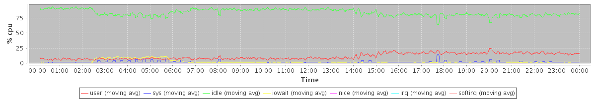 avg(user) = 11.41 avg(sys) = 2.09 avg(idle) = 84.30 avg(iowait) = 1.99 avg(nice) = 0.10 avg(irq) = 0.00 avg(softirq) = 0.12