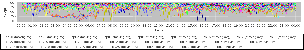 avg(cpu0) = 22.50 avg(cpu1) = 21.85 avg(cpu2) = 20.09 avg(cpu3) = 21.66 avg(cpu4) = 13.78 avg(cpu5) = 14.76 avg(cpu6) = 12.48 avg(cpu7) = 15.73 avg(cpu8) = 10.60 avg(cpu9) = 11.40 avg(cpu10) = 9.32 avg(cpu11) = 19.30 avg(cpu12) = 9.20 avg(cpu13) = 5.51 avg(cpu14) = 7.27 avg(cpu15) = 7.57 avg(cpu16) = 9.90 avg(cpu17) = 6.49 avg(cpu18) = 7.68 avg(cpu19) = 5.18 avg(cpu20) = 6.02 avg(cpu21) = 5.37 avg(cpu22) = 5.20 avg(cpu23) = 4.94