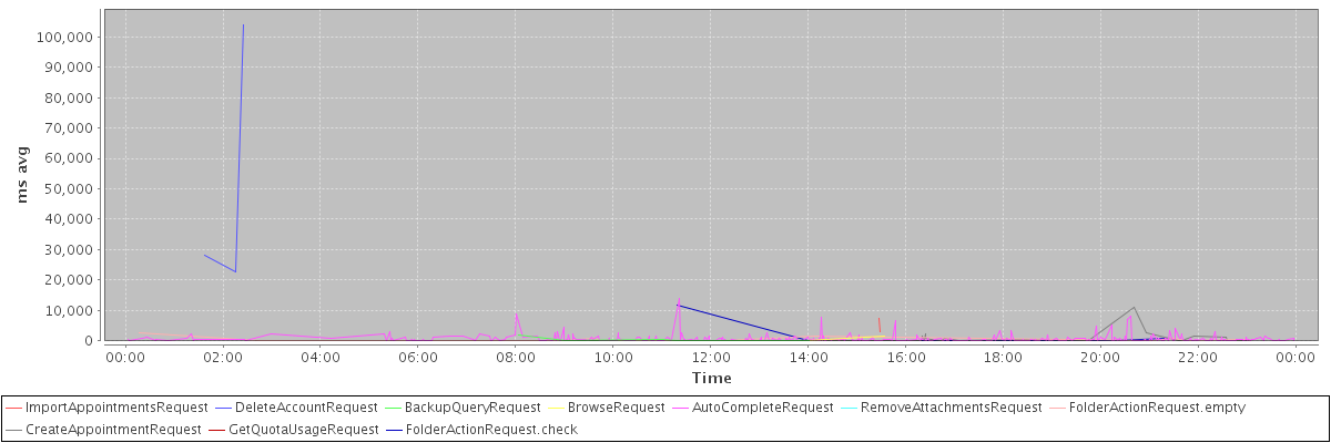 avg(ImportAppointmentsRequest) = 5325.50 avg(DeleteAccountRequest) = 51596.67 avg(BackupQueryRequest) = 525.80 avg(BrowseRequest) = 786.00 avg(AutoCompleteRequest) = 588.30 avg(RemoveAttachmentsRequest) = 2061.00 avg(FolderActionRequest.empty) = 549.71 avg(CreateAppointmentRequest) = 707.44 avg(GetQuotaUsageRequest) = 2541.00 avg(FolderActionRequest.check) = 2066.83