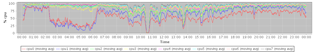 avg(cpu0) = 22.34 avg(cpu1) = 16.77 avg(cpu2) = 1.71 avg(cpu3) = 2.32 avg(cpu4) = 0.95 avg(cpu5) = 0.99 avg(cpu6) = 0.56 avg(cpu7) = 0.45