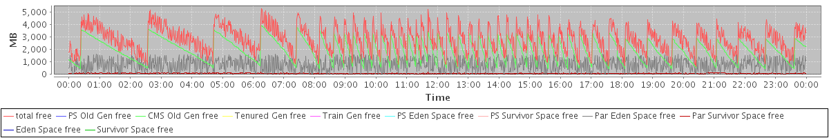 avg(total free) = 2801.92 avg(PS Old Gen free) = 0.00 avg(CMS Old Gen free) = 1927.37 avg(Tenured Gen free) = 0.00 avg(Train Gen free) = 0.00 avg(PS Eden Space free) = 0.00 avg(PS Survivor Space free) = 0.00 avg(Par Eden Space free) = 801.31 avg(Par Survivor Space free) = 73.24 avg(Eden Space free) = 0.00 avg(Survivor Space free) = 0.00