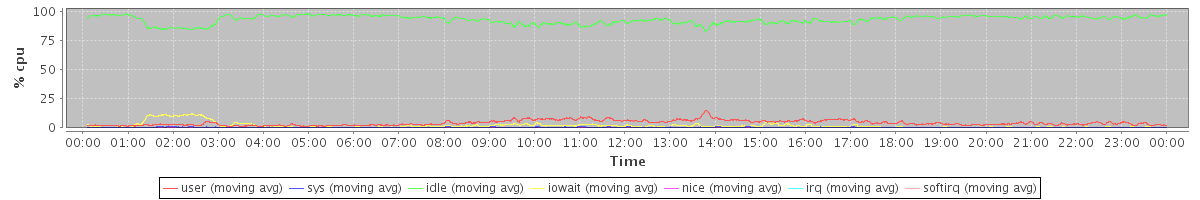 avg(user) = 4.22 avg(sys) = 0.41 avg(idle) = 93.39 avg(iowait) = 1.82 avg(nice) = 0.10 avg(irq) = 0.00 avg(softirq) = 0.03