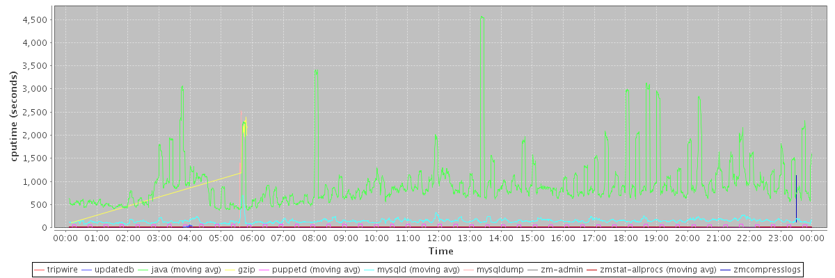 avg(tripwire) = 2007.00 avg(updatedb) = 28.22 avg(java) = 961.23 avg(gzip) = 1987.91 avg(puppetd) = 16.37 avg(mysqld) = 149.95 avg(mysqldump) = 1478.22 avg(zm-admin) = 10.17 avg(zmstat-allprocs) = 15.76 avg(zmcompresslogs) = 632.50