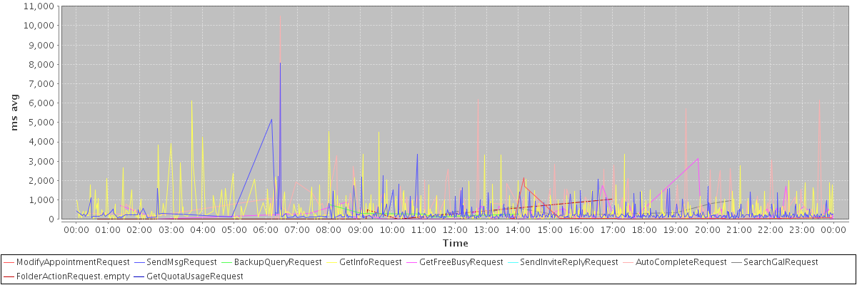 avg(ModifyAppointmentRequest) = 274.38 avg(SendMsgRequest) = 302.59 avg(BackupQueryRequest) = 339.60 avg(GetInfoRequest) = 383.72 avg(GetFreeBusyRequest) = 243.35 avg(SendInviteReplyRequest) = 352.00 avg(AutoCompleteRequest) = 552.95 avg(SearchGalRequest) = 399.50 avg(FolderActionRequest.empty) = 312.60 avg(GetQuotaUsageRequest) = 2118.00