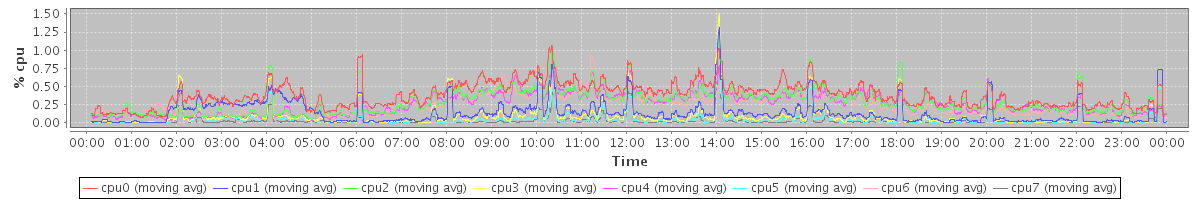 avg(cpu0) = 1.20 avg(cpu1) = 0.95 avg(cpu2) = 0.80 avg(cpu3) = 0.55 avg(cpu4) = 0.78 avg(cpu5) = 0.46 avg(cpu6) = 0.71 avg(cpu7) = 0.41