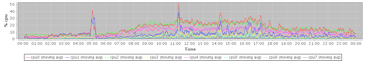 avg(cpu0) = 22.54 avg(cpu1) = 13.28 avg(cpu2) = 0.92 avg(cpu3) = 1.34 avg(cpu4) = 0.74 avg(cpu5) = 0.55 avg(cpu6) = 0.75 avg(cpu7) = 0.22