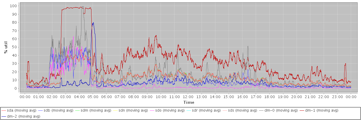 avg(sda) = 12.50 avg(sdb) = 8.64 avg(sdm) = 12.52 avg(sdn) = 8.63 avg(sdo) = 4.68 avg(sdr) = 12.53 avg(sds) = 8.63 avg(dm-0) = 16.54 avg(dm-1) = 33.01 avg(dm-2) = 6.06