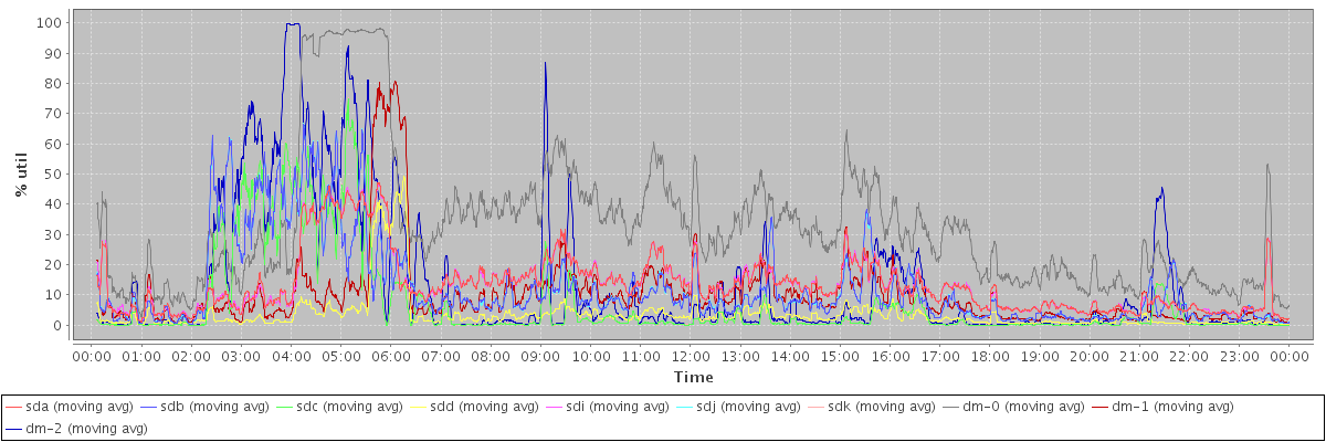 avg(sda) = 13.48 avg(sdb) = 12.31 avg(sdc) = 7.09 avg(sdd) = 3.60 avg(sdi) = 13.51 avg(sdj) = 12.29 avg(sdk) = 7.09 avg(dm-0) = 33.01 avg(dm-1) = 9.92 avg(dm-2) = 13.21