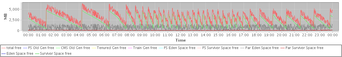 avg(total free) = 3207.69 avg(PS Old Gen free) = 0.00 avg(CMS Old Gen free) = 2309.50 avg(Tenured Gen free) = 0.00 avg(Train Gen free) = 0.00 avg(PS Eden Space free) = 0.00 avg(PS Survivor Space free) = 0.00 avg(Par Eden Space free) = 802.40 avg(Par Survivor Space free) = 95.79 avg(Eden Space free) = 0.00 avg(Survivor Space free) = 0.00