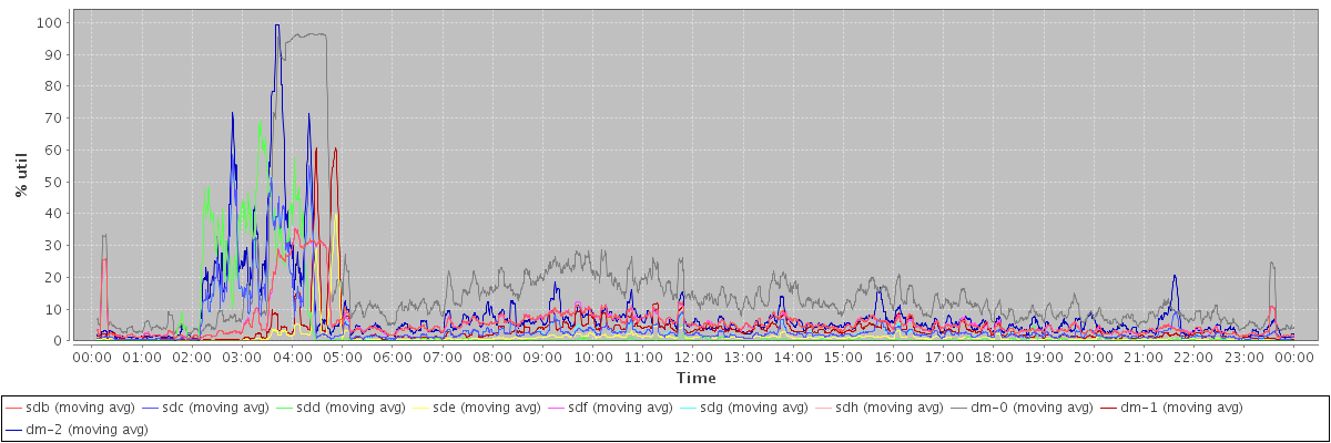 avg(sdb) = 5.94 avg(sdc) = 4.21 avg(sdd) = 3.67 avg(sde) = 1.27 avg(sdf) = 5.93 avg(sdg) = 4.20 avg(sdh) = 3.68 avg(dm-0) = 15.94 avg(dm-1) = 3.53 avg(dm-2) = 8.26