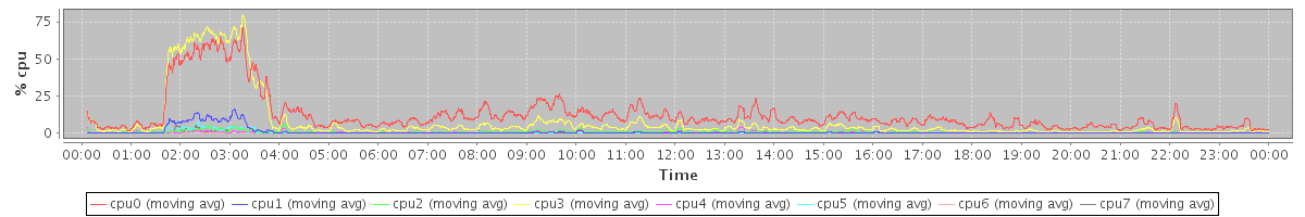 avg(cpu0) = 12.12 avg(cpu1) = 0.74 avg(cpu2) = 0.54 avg(cpu3) = 7.55 avg(cpu4) = 0.32 avg(cpu5) = 0.29 avg(cpu6) = 0.10 avg(cpu7) = 0.11