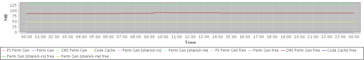 avg(PS Perm Gen) = 0.00 avg(Perm Gen) = 0.00 avg(CMS Perm Gen) = 130.60 avg(Code Cache) = 47.53 avg(Perm Gen [shared-ro]) = 0.00 avg(Perm Gen [shared-rw]) = 0.00 avg(PS Perm Gen free) = 0.00 avg(Perm Gen free) = 0.00 avg(CMS Perm Gen free) = 88.73 avg(Code Cache free) = 0.41 avg(Perm Gen [shared-ro] free) = 0.00 avg(Perm Gen [shared-rw] free) = 0.00