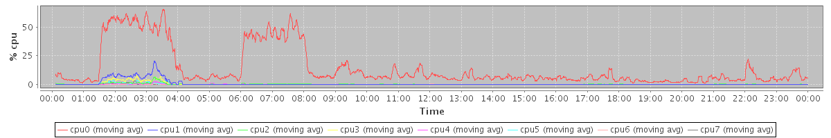 avg(cpu0) = 14.02 avg(cpu1) = 0.78 avg(cpu2) = 0.29 avg(cpu3) = 0.36 avg(cpu4) = 0.12 avg(cpu5) = 0.14 avg(cpu6) = 0.04 avg(cpu7) = 0.08