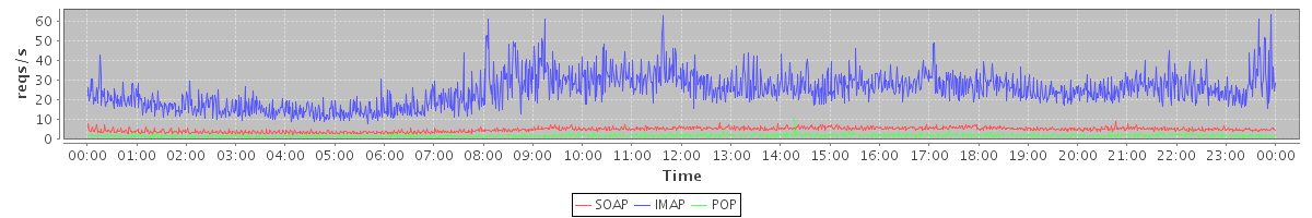 Host zm02.stanford.edu: Mailboxd: Request Rate by Client Protocol