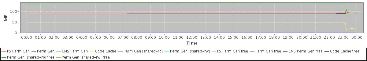 avg(PS Perm Gen) = 0.00 avg(Perm Gen) = 0.00 avg(CMS Perm Gen) = 133.43 avg(Code Cache) = 46.48 avg(Perm Gen [shared-ro]) = 0.00 avg(Perm Gen [shared-rw]) = 0.00 avg(PS Perm Gen free) = 0.00 avg(Perm Gen free) = 0.00 avg(CMS Perm Gen free) = 92.18 avg(Code Cache free) = 0.39 avg(Perm Gen [shared-ro] free) = 0.00 avg(Perm Gen [shared-rw] free) = 0.00