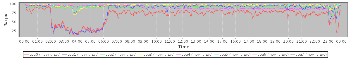 avg(cpu0) = 20.82 avg(cpu1) = 13.82 avg(cpu2) = 0.68 avg(cpu3) = 1.01 avg(cpu4) = 0.42 avg(cpu5) = 0.31 avg(cpu6) = 0.13 avg(cpu7) = 0.45