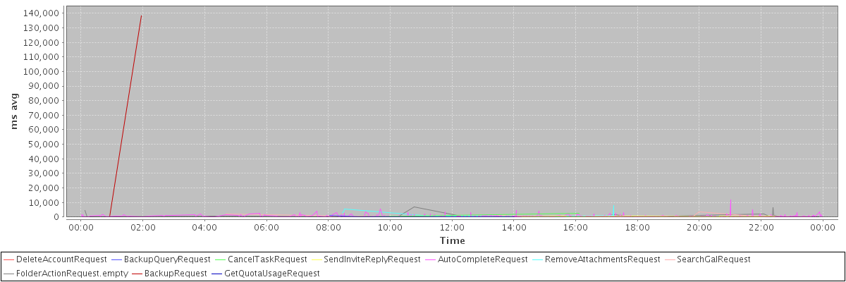 avg(DeleteAccountRequest) = 30131.00 avg(BackupQueryRequest) = 401.80 avg(CancelTaskRequest) = 1378.00 avg(SendInviteReplyRequest) = 376.50 avg(AutoCompleteRequest) = 517.16 avg(RemoveAttachmentsRequest) = 2302.08 avg(SearchGalRequest) = 554.77 avg(FolderActionRequest.empty) = 832.30 avg(BackupRequest) = 69313.00 avg(GetQuotaUsageRequest) = 1963.00