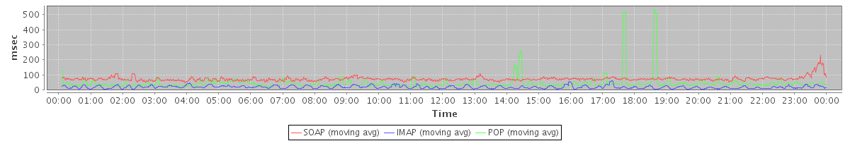 avg(DeleteAccountRequest) = 36271.33 avg(GetInfoRequest) = 419.95 avg(GetFreeBusyRequest) = 425.11 avg(AutoCompleteRequest) = 501.37 avg(CreateTaskRequest) = 929.00 avg(SearchGalRequest) = 370.67 avg(FolderActionRequest.empty) = 449.45 avg(BackupRequest) = 48287.00 avg(GetQuotaUsageRequest) = 1575.00 avg(ModifyAccountRequest) = 665.75