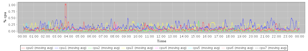 avg(cpu0) = 14.03 avg(cpu1) = 0.77 avg(cpu2) = 0.60 avg(cpu3) = 7.77 avg(cpu4) = 0.38 avg(cpu5) = 0.33 avg(cpu6) = 0.09 avg(cpu7) = 0.10