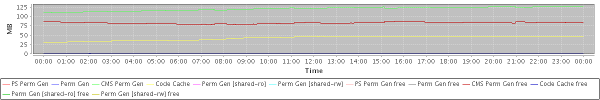 avg(PS Perm Gen) = 0.00 avg(Perm Gen) = 0.00 avg(CMS Perm Gen) = 120.32 avg(Code Cache) = 42.60 avg(Perm Gen [shared-ro]) = 0.00 avg(Perm Gen [shared-rw]) = 0.00 avg(PS Perm Gen free) = 0.00 avg(Perm Gen free) = 0.00 avg(CMS Perm Gen free) = 82.70 avg(Code Cache free) = 0.37 avg(Perm Gen [shared-ro] free) = 0.00 avg(Perm Gen [shared-rw] free) = 0.00