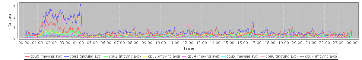 avg(cpu0) = 0.04 avg(cpu1) = 0.16 avg(cpu2) = 0.02 avg(cpu3) = 0.02 avg(cpu4) = 0.01 avg(cpu5) = 0.01 avg(cpu6) = 0.04 avg(cpu7) = 0.00