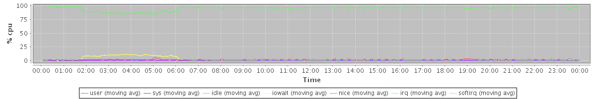 avg(user) = 1.83 avg(sys) = 0.43 avg(idle) = 95.42 avg(iowait) = 2.17 avg(nice) = 0.10 avg(irq) = 0.00 avg(softirq) = 0.04