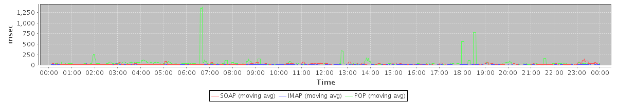 avg(SendMsgRequest) = 230.08 avg(GetShareInfoRequest) = 234.50 avg(BackupQueryRequest) = 221.00 avg(CancelAppointmentRequest) = 271.38 avg(AutoCompleteRequest) = 441.73 avg(ApplyFilterRulesRequest) = 3169.00 avg(FolderActionRequest.empty) = 442.09 avg(SyncGalAccountRequest) = 41861.46 avg(BackupRequest) = 8209.00 avg(GetQuotaUsageRequest) = 1850.00