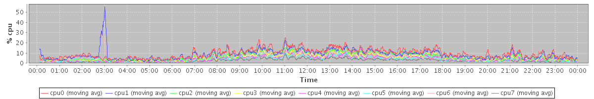 avg(cpu0) = 9.35 avg(cpu1) = 8.55 avg(cpu2) = 6.62 avg(cpu3) = 5.58 avg(cpu4) = 4.57 avg(cpu5) = 4.08 avg(cpu6) = 5.12 avg(cpu7) = 2.73