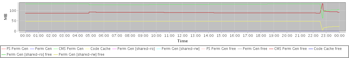 avg(PS Perm Gen) = 0.00 avg(Perm Gen) = 0.00 avg(CMS Perm Gen) = 128.13 avg(Code Cache) = 46.04 avg(Perm Gen [shared-ro]) = 0.00 avg(Perm Gen [shared-rw]) = 0.00 avg(PS Perm Gen free) = 0.00 avg(Perm Gen free) = 0.00 avg(CMS Perm Gen free) = 89.37 avg(Code Cache free) = 0.49 avg(Perm Gen [shared-ro] free) = 0.00 avg(Perm Gen [shared-rw] free) = 0.00