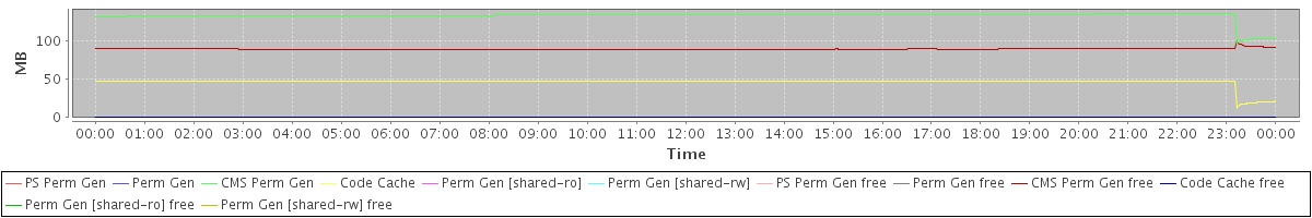 avg(PS Perm Gen) = 0.00 avg(Perm Gen) = 0.00 avg(CMS Perm Gen) = 133.21 avg(Code Cache) = 46.57 avg(Perm Gen [shared-ro]) = 0.00 avg(Perm Gen [shared-rw]) = 0.00 avg(PS Perm Gen free) = 0.00 avg(Perm Gen free) = 0.00 avg(CMS Perm Gen free) = 89.76 avg(Code Cache free) = 0.36 avg(Perm Gen [shared-ro] free) = 0.00 avg(Perm Gen [shared-rw] free) = 0.00