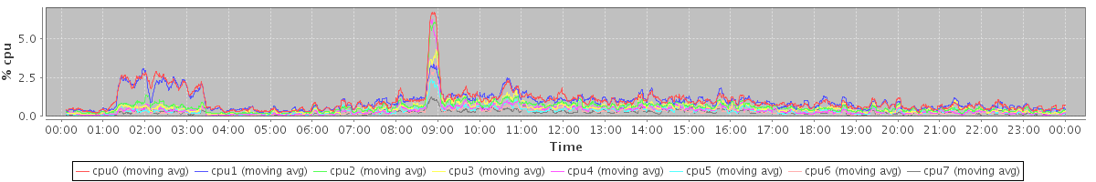avg(cpu0) = 0.14 avg(cpu1) = 0.19 avg(cpu2) = 0.08 avg(cpu3) = 0.07 avg(cpu4) = 0.05 avg(cpu5) = 0.03 avg(cpu6) = 0.03 avg(cpu7) = 0.02