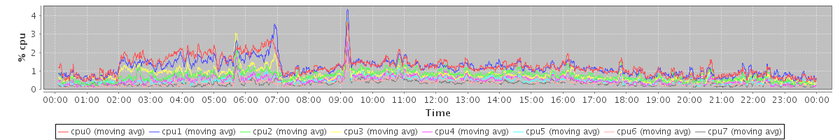 avg(cpu0) = 1.24 avg(cpu1) = 1.18 avg(cpu2) = 0.75 avg(cpu3) = 0.78 avg(cpu4) = 0.54 avg(cpu5) = 0.52 avg(cpu6) = 0.37 avg(cpu7) = 0.34