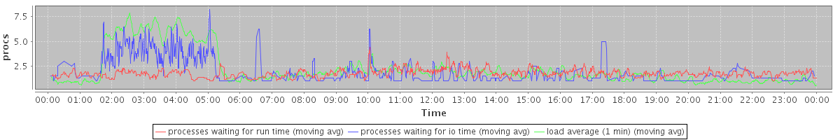 avg(processes waiting for run time) = 0.99 avg(processes waiting for io time) = 0.89 avg(load average (1 min)) = 2.16