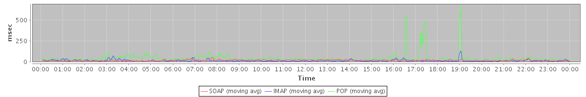 avg(SendMsgRequest) = 178.82 avg(BackupQueryRequest) = 482.00 avg(GetFreeBusyRequest) = 239.63 avg(SendInviteReplyRequest) = 363.00 avg(AutoCompleteRequest) = 496.70 avg(RemoveAttachmentsRequest) = 208.80 avg(FolderActionRequest.empty) = 299.26 avg(SyncGalAccountRequest) = 1335.29 avg(BackupRequest) = 8426.00 avg(GetQuotaUsageRequest) = 1367.00