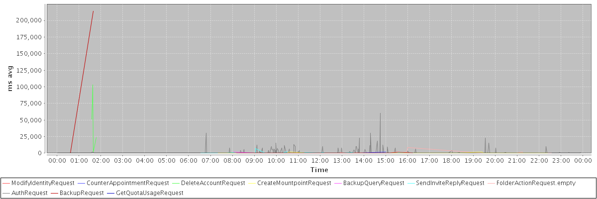 avg(ModifyIdentityRequest) = 456.60 avg(CounterAppointmentRequest) = 617.00 avg(DeleteAccountRequest) = 44806.75 avg(CreateMountpointRequest) = 394.74 avg(BackupQueryRequest) = 356.60 avg(SendInviteReplyRequest) = 563.73 avg(FolderActionRequest.empty) = 659.26 avg(AuthRequest) = 489.67 avg(BackupRequest) = 107309.00 avg(GetQuotaUsageRequest) = 1608.00