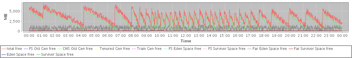 avg(total free) = 3532.75 avg(PS Old Gen free) = 0.00 avg(CMS Old Gen free) = 2652.02 avg(Tenured Gen free) = 0.00 avg(Train Gen free) = 0.00 avg(PS Eden Space free) = 0.00 avg(PS Survivor Space free) = 0.00 avg(Par Eden Space free) = 798.19 avg(Par Survivor Space free) = 82.54 avg(Eden Space free) = 0.00 avg(Survivor Space free) = 0.00
