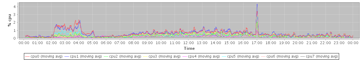 avg(cpu0) = 0.17 avg(cpu1) = 0.13 avg(cpu2) = 0.03 avg(cpu3) = 0.03 avg(cpu4) = 0.02 avg(cpu5) = 0.02 avg(cpu6) = 0.01 avg(cpu7) = 0.01