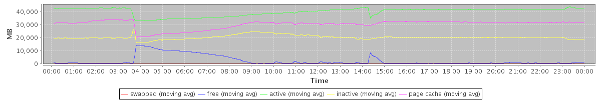 avg(swapped) = 0.25 avg(free) = 2426.44 avg(active) = 39894.86 avg(inactive) = 20355.29 avg(page cache) = 30265.65